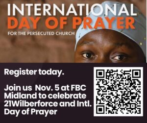 Every year, Christians around the world set a day aside for prayer for our sisters and brothers who are persecuted for their faith Please join First Baptist Church Midland and others from the Midland, Texas community on the Day of Prayer for the Persecuted Church for a free banquet in the First Baptist Midland Fellowship Hall at 5PM, followed by a time of worship at 6PM in the First Baptist Midland Worship Center. Register here.