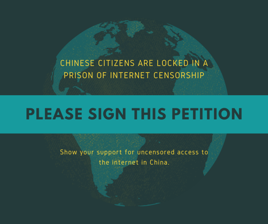 STAND WITH CITIZENS IN CHINA WHO ARE DESPERATE TO ACCESS ACCURATE INFORMATION ON THE INTERNET THAT IS NOT CENSORED BY CHINA’S COMMUNIST PARTY. SIGN PETITION.
