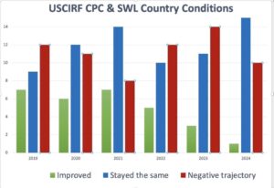 Each year USCIRF offers an analysis of whether conditions in certain countries have improved, deteriorated, or stayed the same over the prior year. Former USCIRF Commissioner and current President of the IRF Secretariat, Nadine Maenza, shared a chart highlighting deteriorating conditions globally as discussed in the report.