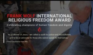 In 2018 21Wilberforce launched the Frank Wolf International Religious Freedom Award to recognize outstanding champions who stand up to oppression, even at great personal risk, in the pursuit of freedom of religion, belief or conscience. The Frank Wolf International Religious Freedom Award identifies and honors those who embody Congressman Frank Wolf, who has worked tirelessly for decades to promote international religious freedom and who later served as Distinguished Senior Fellow at 21Wilberforce.